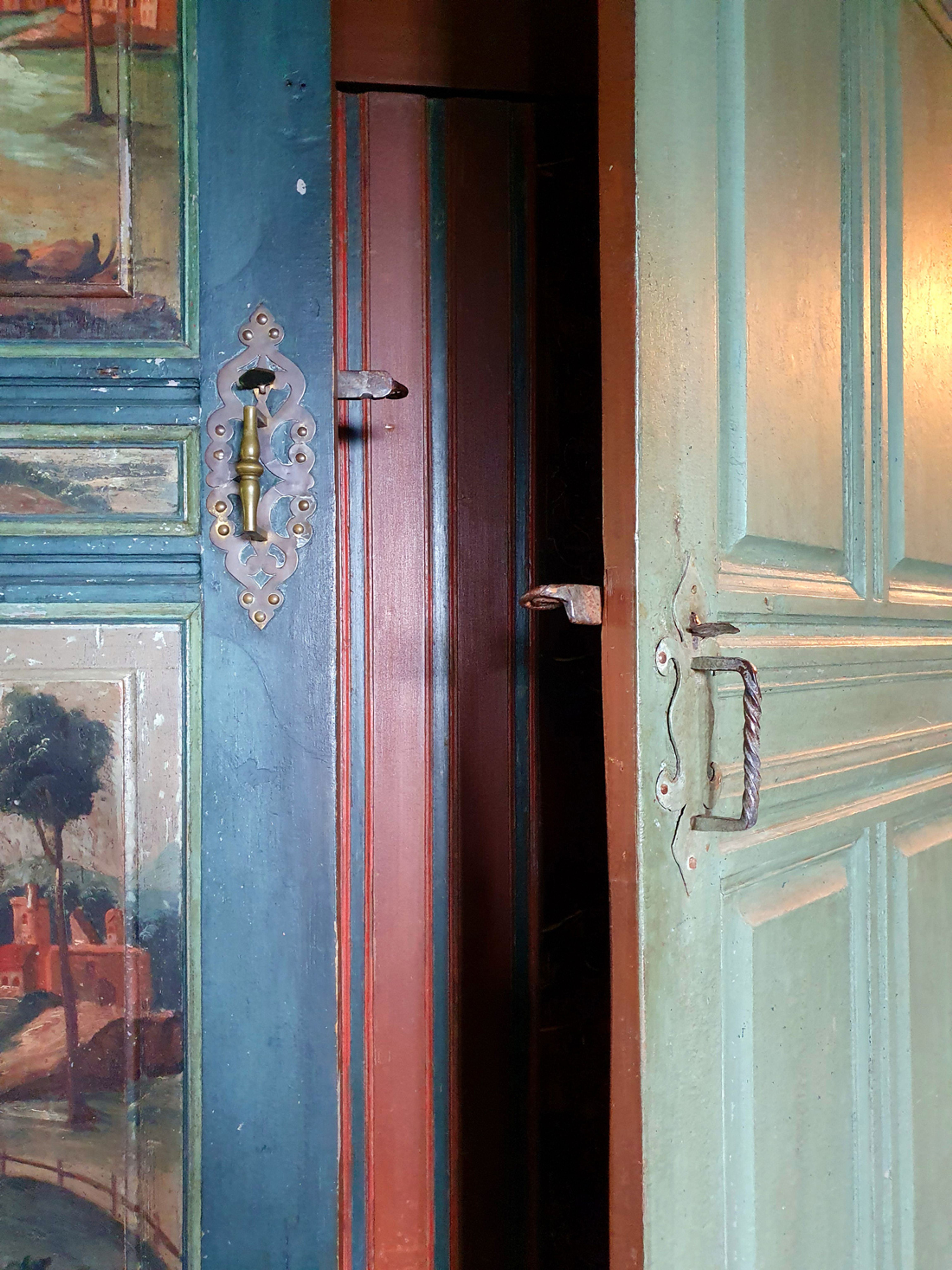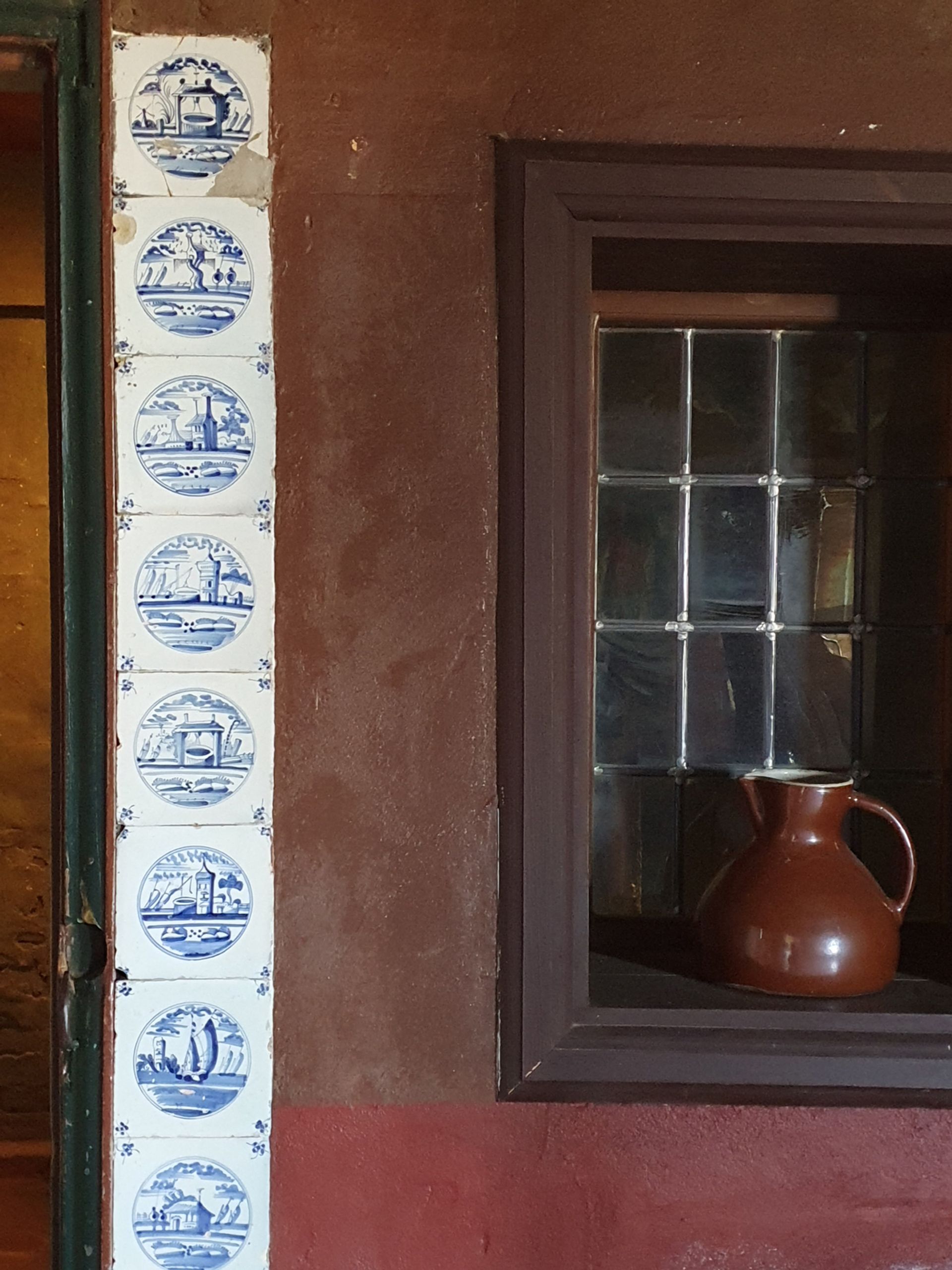 Stue i Kommandørgården med hollandske fliser, bemalede døre med landskabsmotiver, kiste og malet loft