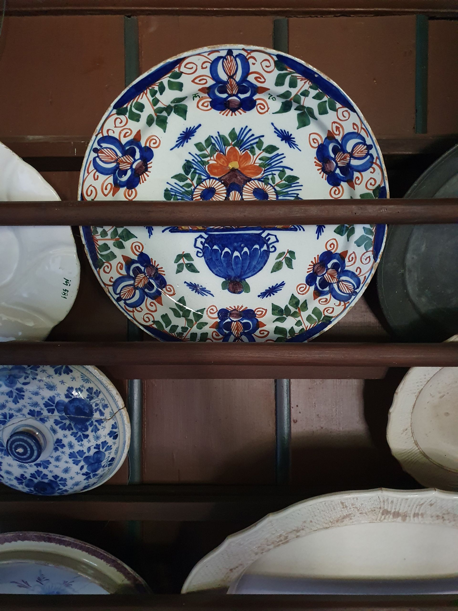 Bemalet standur og barok chatol med vitrineskab i Kommandørgårdens stue med hollandske fliser på væggene