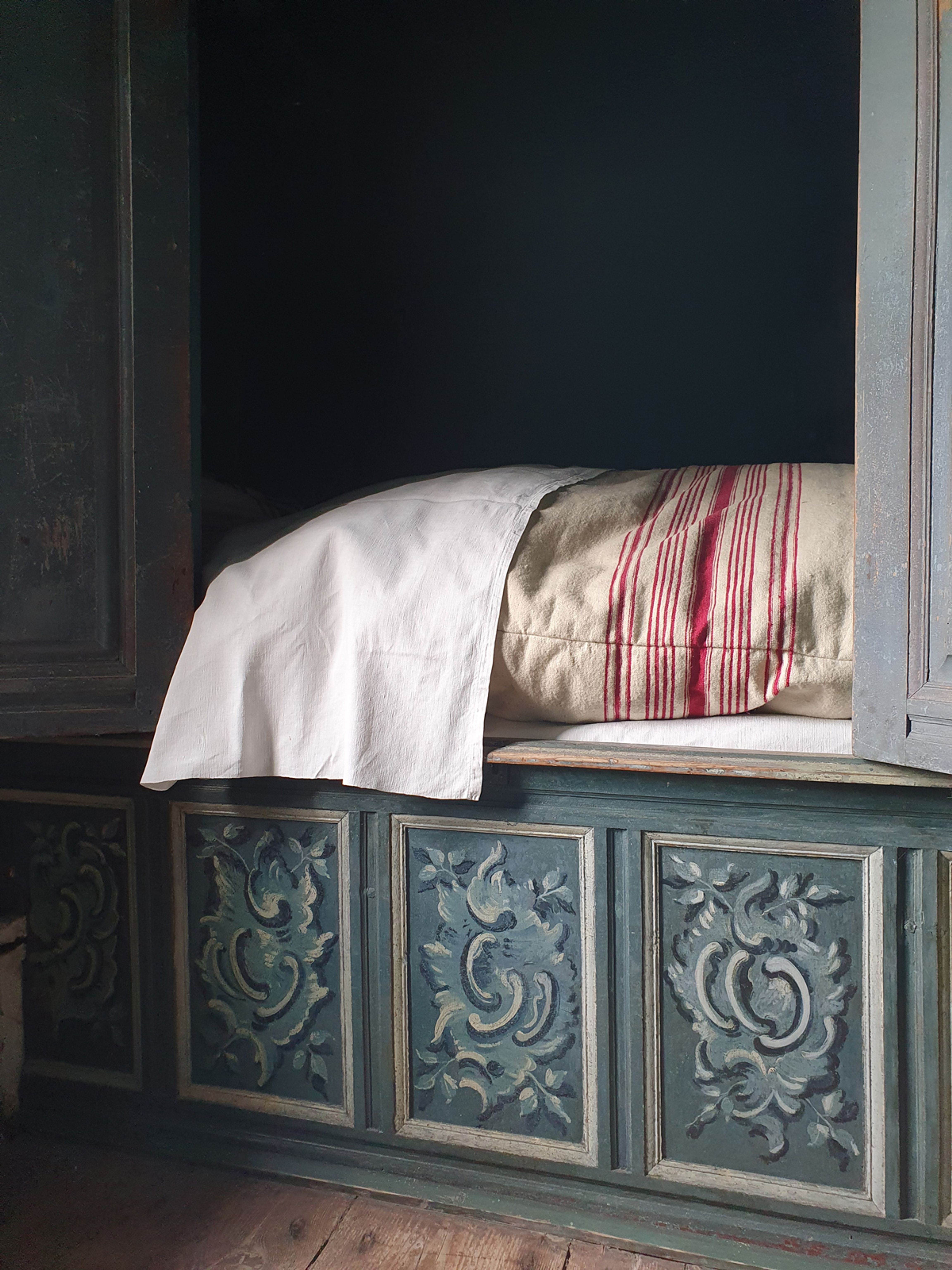 Stue i Kommandørgården med blomstermalet vægdekoration, bemalede døre, udskåret kiste og malet bjælkeloft